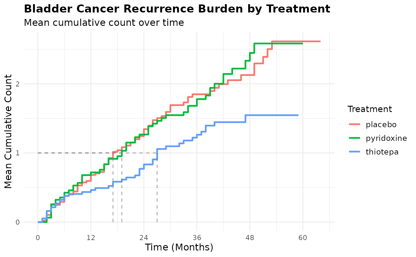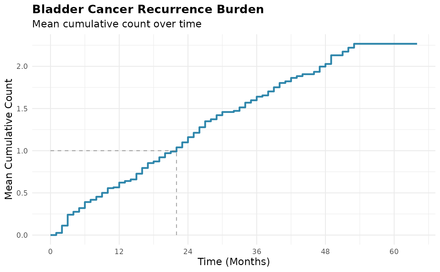 Many patients experience events that can occur multiple times—like hospital readmissions, infections, or tumor recurrences. Traditional survival analysis is only concerned with the first event and does not account for competing risks like death. Alternatively, the mean cumulative count (MCC) provides a more complete picture by estimating the expected number of events per person by a given time, properly accounting for: